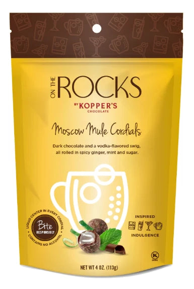 A spirited indulgence for the adventurous palate: dark chocolate cordials rolled in a fiery blend of sugar, ginger, and mint, with a smooth vodka-infused center. Each bite delivers a bold burst of spice and cool sophistication—like a cocktail in chocolate form.